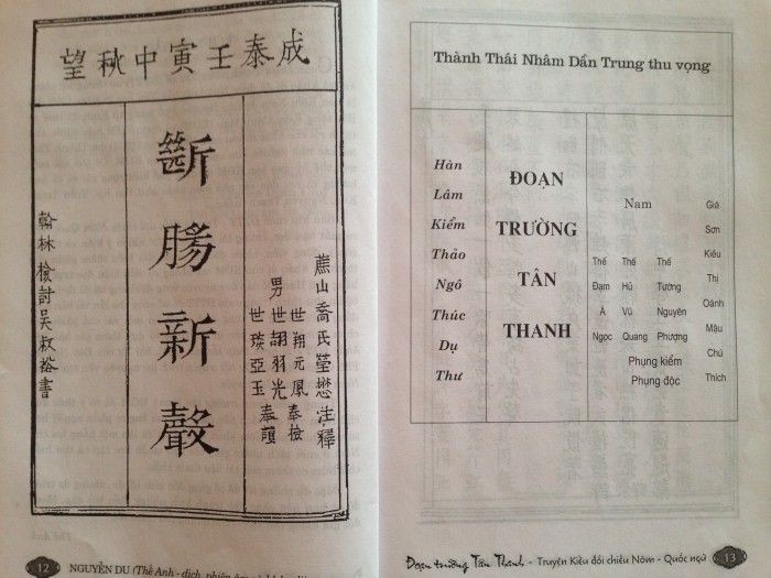 Ví dụ câu thơ tám chữ trong Truyện Kiều: Sắc đành đòi một, tài đành họa hai. Chữ Nôm thứ ba viết 隊 ĐỘI, xưa nay các bản phiên âm Nôm sang Quốc ngữ đều phiên là đòi, nhưng học giả Hoàng Xuân Hãn lại nói chữ đó nên đọc là trọi. Hoặc sáu chữ của câu Êm đềm trướng rủ màn che, chữ Nôm thứ hai viết 念NIỆM, nhiều người phiên âm là đềm, nhưng học giả Trương Vĩnh Ký lại phiên là nềm, vì ở thời Nguyễn Du thì êm nềm đồng nghĩa với êm đềm.