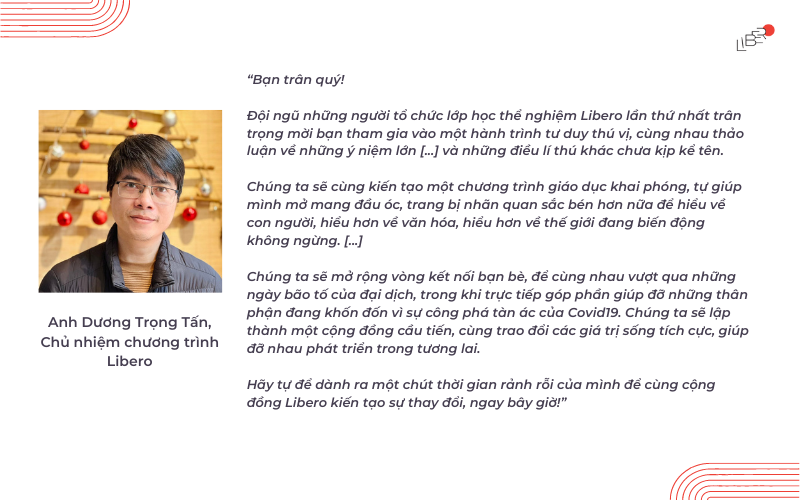 Tham gia vào quá trình tuyển sinh Libero22 – khóa thứ 2 của chương trình, tôi để ý câu đầu tiên mà anh Tấn thường hỏi khi phỏng vấn học viên: “Kỳ vọng của bạn khi tham gia Libero là gì?”.