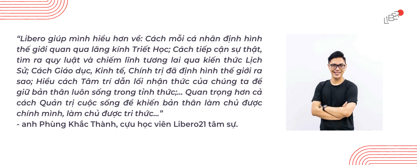 “Libero giúp mình hiểu hơn về: Cách mỗi cá nhân định hình thế giới quan qua lăng kính Triết Học; Cách tiếp cận sự thật, tìm ra quy luật và chiếm lĩnh tương lai qua kiến thức Lịch Sử; Cách Giáo dục, Kinh tế, Chính trị đã định hình thế giới ra sao; Hiểu cách Tâm trí dẫn lối nhận thức của chúng ta để giữ bản thân luôn sống trong tỉnh thức;… Quan trọng hơn cả cách Quản trị cuộc sống để khiến bản thân làm chủ được chính mình, làm chủ được tri thức…” – anh Phùng Khắc Thành, cựu học viên Libero21 tâm sự.